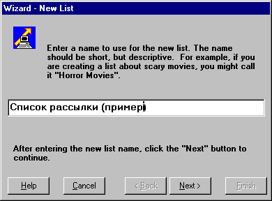 Выберите пункты главного меню программы Lists/Add (или щелкните левой кнопкой мыши по второй пиктограмме в диалоге Lists). Появится Мастер настройки списка рассылки. Далее по шагам будет предложено ввести самые необходимые для нормального функционирования списка рассылки данные (Будьте внимательны ! Не копируйте бездумно указанные в строках ввода наши записи-примеры):