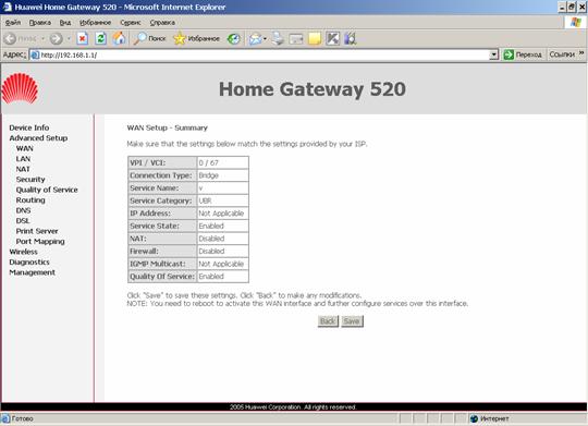 Процедура настройки осуществляется через Web-конфигуратор. Запустите Web-браузер, предварительно убедившись, что там отключен прокси-сервер (Сервис -> Свойства обозревателя -> Подключения -> Настройка LAN), и введите адрес "http://192.168.1.1". Введите "admin" в качестве имени пользователя, "admin" (по умолчанию) в качестве пароля и щелкните OK. При вводе пароля набираемые символы на экране заменяются на символы точки "?".Должна загрузиться страница Home Gateway520 показывающая параметры модема.