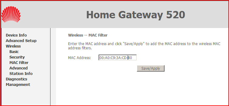 Вводим MAC-адрес в том формате, который принят авторами программного обеспечения модема и нажимаем Save/Apply.