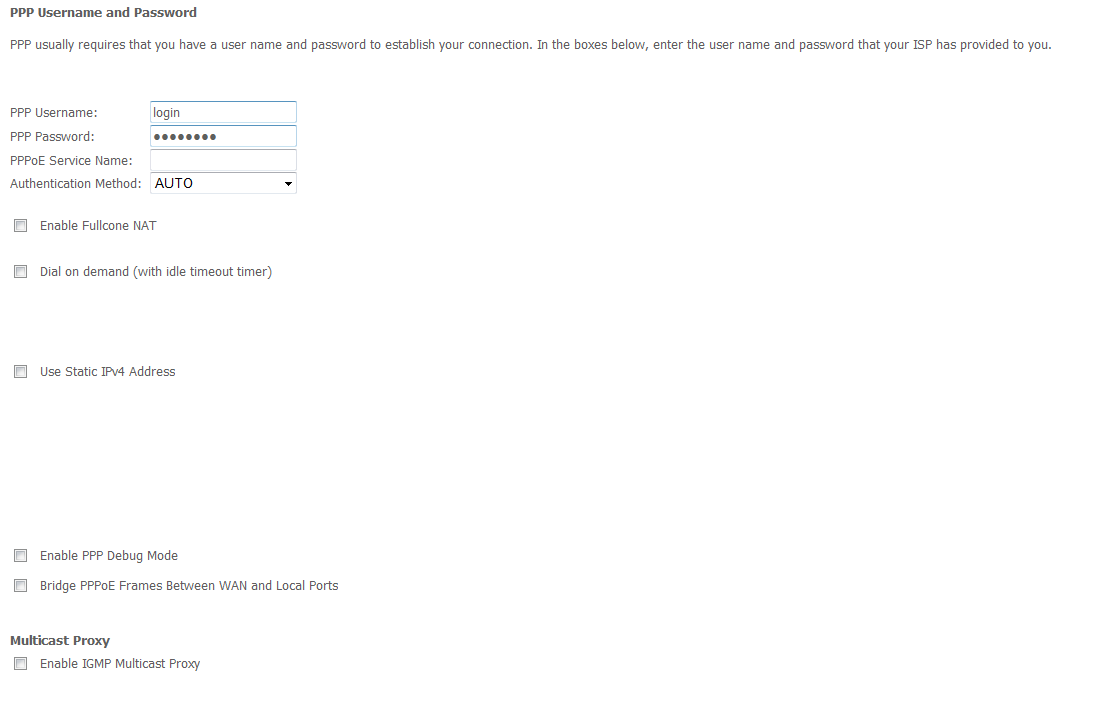 Укажите Логин и Пароль для доступа к Интернет, в соответствующие поля и нажмите Next.