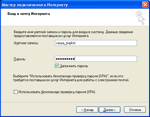 Теперь Вам надо указать учетную запись и пароль. Нажмите кнопку "Далее".